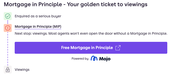 This was used alongside visuals that could imply that the viewings stage of the process was in fact ‘locked’ from the buyer, until buyers completed the step of gaining a MIP, specifically from Zoopla’s own third-party provider, Mojo Mortgages.